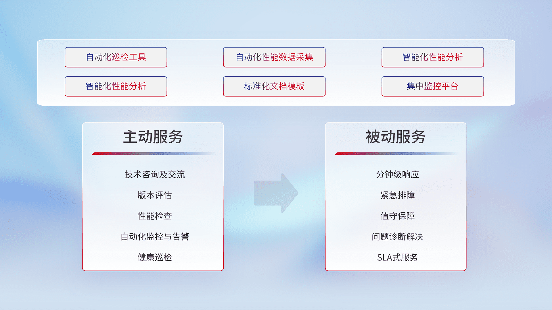 智能化工具和标准化文档,,,,保障服务质量,,提供主动服务(包含技术咨询、、版本评估、、、性能检查、、、自动化监控与告警、、、、健康巡检)和被动服务包含(分钟级响应、、、、紧急排障、、、、值守保障、、、、问题诊断解决、、、SLA服务)。。。
